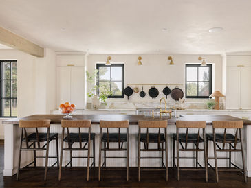 A defining interior feature is the dramatic slatted wood accent wall spanning the kitchen and dining area, seamlessly concealing the pantry, integrated refrigerator, and built-in banquette cabinetry. Each slat was intentionally spaced to create depth, rhythm, and architectural cohesion throughout the space.